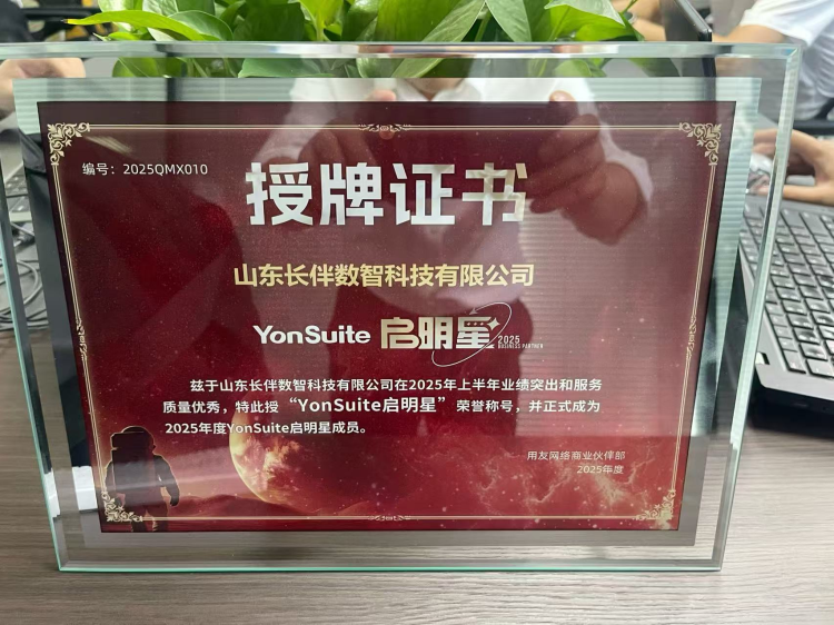 2025年9月 ,山东长伴数智科技有限公司凭借 2025 年上半年突出的业绩以及优秀的服务质量,被用友网络商业伙伴部授予 “YonSuite 启明星” 荣誉称号,正式成为2025 年度 YonSuite 启明星成员。